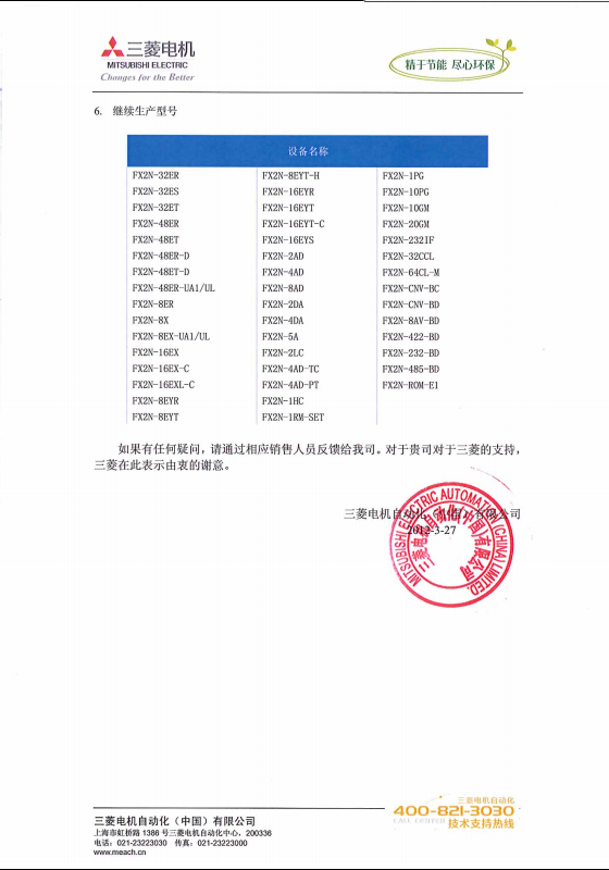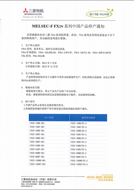 FX2N系列中国产品停产通知